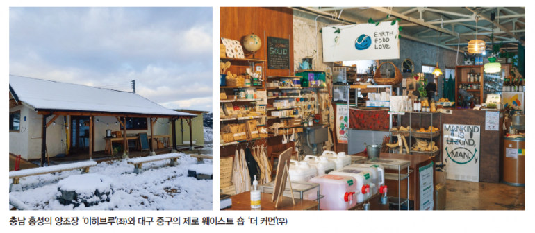 자연농1)을 하는 남경숙, 이연진 부부 농부를 만나러 기차를 타고 충남 홍성의 ‘풀풀농장’으로 갔을 때 그냥 그 여정 자체가 여행 같았거든요? 그곳 홍동마을의 양조장 ‘이히브루’에 가서 인터뷰를 했는데요 (편집자 주: 인터뷰 시점인 2023년에 남경숙, 이연진 부부는 13년간 이어온 자연농 농산물 꾸러미 판매 사업을 중단하고, 농산물로 유기농 맥주를 생산하는 양조장 ‘이히브루’를 열었다). 양조장이 아담한데 안에 들어가면 아늑하고 건축적으로도 멋있어요. 맥주 만드는 기계 설비도 멋지고요. 이히브루는 판매한 맥주병을 수거해 재사용하는데요. 인터뷰 중 이연진 농부님이 수거해 온 맥주병의 라벨지를 계속 떼면서 말씀을 하시는데 저는 그 장면이 너무 흥미로웠어요. 아내분은 부산스럽게 왜 그걸 떼고 있느냐고 핀잔을 주시기도 했지만. (웃음) 그리고 대구의 제로 웨이스트 숍 ‘더 커먼’의 강경민 대표님을 만나러 가서도 그 공간을 느끼면서 그곳의 음식도 먹고, 그분이 설명하시는 것들을 바로바로 볼 수 있어서 더 좋았어요. 오감을 활용해 인터뷰이의 일과 삶을 이해했던 시간들이 기억에 남아요.
