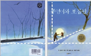 표지를 한번 볼까요? 뒤표지에서부터 이어지는 수평선이 앞표지 왼쪽의 가느다란 나무와 만나 수직을 이루고 있는 것이 보입니다. 수평선과 수직선이 만나고 눈 쌓인 언덕을 오르는 사선이 시작되는 자리에 주요 인물이 배치되어 있습니다. 보름달과 아빠와 아이가 있는 자리에서 수직으로 올라가보면 ‘부엉이’라는 단어의 첫 글자와 만납니다. 수평에서 완만하게 상승하는 사선에 서는 숨을 고르고 천천히 올라갈 준비를 하게 됩니다.
