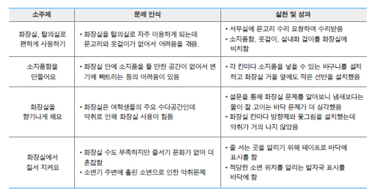 처음에 가졌던 문제의식이 무엇이었는지 다시 생각하게 하고 문제 해결을 위해서 어떠한 노력을 기울였는지, 사회참여 활동을 실제로 하면서 처음에 생각했던 문제나 혹은 해결책에 있어서 잘못판단했던 일, 미처 생각하지 못했던 일, 새롭게 알게 된 사실은 없었는지 등을 적어보게 한 뒤 모둠별로 돌아가면서 발표하게 한다.