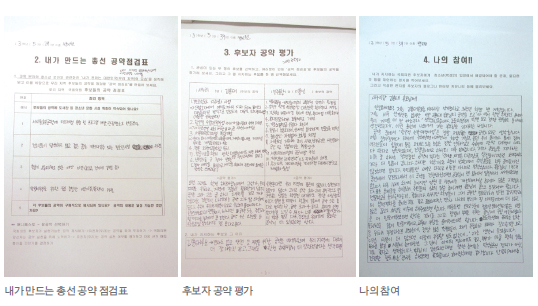 –선거 수행평가 총선이다. 사회과라면 당연히 해야 한다: 총선이 있었기 때문에 당연히 진행했던 선거 수행평가에서는 SMS를 이용하여 지지 후보자에게 글쓰기 등의 방법으로 참여하게 했는데 많은 학생들에게 참여의 경험을 줄 수 있었다.